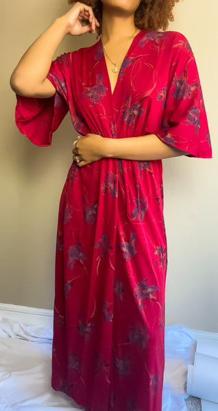Lovely vintage bohemian style floral print robe style dress featuring wide flowy sleeves with with elastic ruching waist. V-Neck wrap neckline with front tie detail.